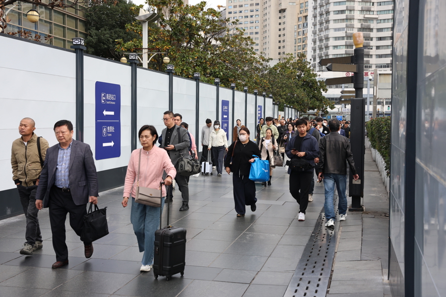 上海火车站南进口改造提升工程启动,施工所涉区域由铝塑板围合起封闭围挡,旅客行走通道宽敞。