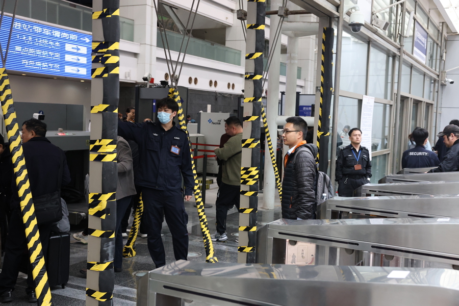 临时南进站口,安检闸机数量并未减少。内外均有工作人员进行引导。